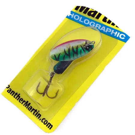 Ett livfullt holografiskt Fire Tiger-mönster utmärker skeden på denna Panther Martin 6, identifierad med produktkod 5010. Med en total längd på 5 cm (2") är spinnaren oanvänd i sin ursprungliga gula blisterförpackning. Den viktade kroppen på 6 g (3/16 oz) är utformad för att underlätta långa kast, kombinerat med den ikoniska konkav-konvexa skeden monterad direkt på axeln. Denna bygelfria design är ett signum för märket Panther Martin, avsedd att möjliggöra omedelbar skedrotation och skapa ljudvibrationer. Producerad i Dominikanska republiken för Harrison-Hoge Industries, är draget utrustat med en vass trekrok i bronsfinish. Den holografiska finishen ger en skimrande effekt över de traditionella gröna och orangea tigerränderna, utformad för att fånga ljuset effektivt i olika vattenförhållanden. All originaltext på förpackningen, inklusive information om den New York-baserade distributören och säkerhetsvarningar, är tydligt läsbar på den gula baksidan.