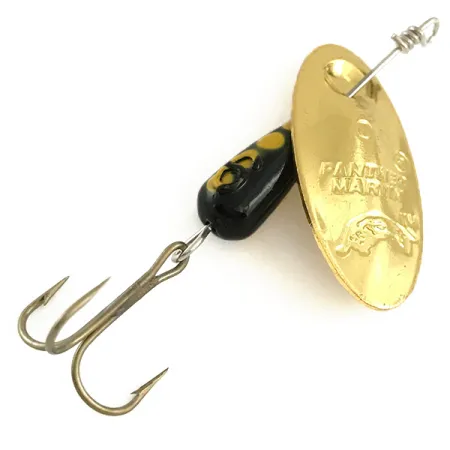 Direkt stämplat i det konvexa guldskeden finns den ikoniska fisklogotypen tillsammans med namnet "PANTHER MARTIN" och storleken "6". Just detta exemplar, med produktkod 6511, har den signifikanta in-line-designen där skeden roterar direkt på axeln utan bygel. Betet mäter 5 cm (2") och väger 6 g (3/16 oz), och balanseras av en viktad svart droppformad kropp med tre lysande gula prickar. Denna spinnare är tillverkad i Italien och utrustad med en vass trekrok i bronsfinish. Som ett obegagnat samlarobjekt behåller betet sin ursprungliga fabrikslyster.
