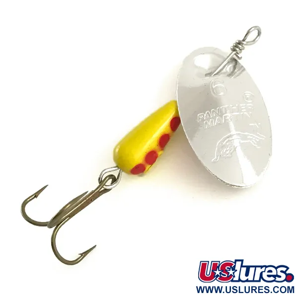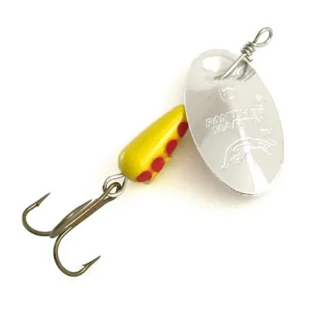 I den silverfärgade skeden är siffran 6 inpräglad, vilket anger storleken på denna klassiska italiensktillverkade inlinespinnare. Med en vikt på 6 g (3/16 oz) och en total längd på 5 cm (2"), uppvisar detta exemplar den traditionella gula droppformade kroppen accentuerad av tydliga röda prickar. Designen på modellen 6512 kännetecknas av att skeden är monterad direkt på trådaxeln, ett signum för märket Panther Martin som eliminerar behovet av en bygel. Detta direktmonteringssystem säkerställer att skeden roterar nära kroppen under invevning. Den silverfärgade skeden har den välkända logotypen med den hoppande pantern och varumärket tydligt stämplat i metallen. Detta specifika bete är oanvänt och i originalskick, och har behållit sin lyster på både den målade kroppen och den polerade skeden. Komponenterna inkluderar en robust trekrok fäst via en fjäderring vid den viktade kroppen, allt byggt på en rak trådram med en ögla upptill för linan.