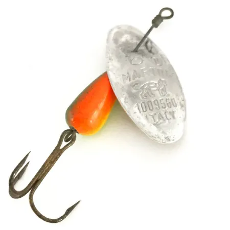 Tydligt präglat på den konvexa sidan av det silverfärgade skeden finns ursprunget "ITALY" och patentnumret 1009560, vilket markerar denna Panther Martin 6 som en genuin del av europeisk sportfiskehistoria. Med en vikt på 6 g och en längd på 5 cm har detta exemplar den klassiska droppformade kroppen i en livfull röd och orange toning över en grön bas. Denna specifika design använder en sked monterad direkt på axeln, vilket möjliggör en bredare rotation och skapar tydliga vibrationer vid hemspinning. Krokarna består av en robust trekrok som visar lätta tecken på ålder men förblir stabil för samling eller användning. Med ett skickbetyg på 4/5 ser betet fint ut med mindre ytslitage som speglar dess vintagekaraktär. Silverskeden är präglad med den karaktäristiska logotypen föreställande ett hoppande kattdjur, vilket identifierar den som en del av 7707-serien. Den viktade kroppen är konstruerad för att fördela massan jämnt för längre och mer exakta kast i trånga vatten.