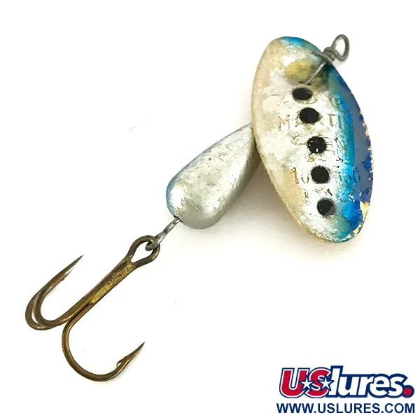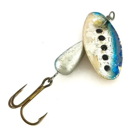 En klassisk droppformad blykropp hjälper denna vintriga spinnare att kasta effektivt med bibehållen balans. Med en vikt på 3/16 oz (6 g) och en total längd på 2" (5 cm), tillhör detta exemplar den ikoniska serien känd för sin unika konstruktion där skeden sitter direkt på axeln. Den konvexa skeden har en finish i silver- och blåtonad gradient med tydliga svarta prickar, ett färgschema som sticker ut från vanligare guld- eller gulmönster. Skeden är tydligt stämplad med tillverkarens logotyp och roterar kring en guldfärgad distanspärla som förhindrar att den kärvar mot den viktade kroppen. Denna specifika Panther Martin 6, med produktkod 7708, har en bronserad trekrok som sitter stadigt på plats. Skicket är klassat som 4/5, med lätt slitage från tidigare fisketurer men med all ursprunglig struktur intakt.