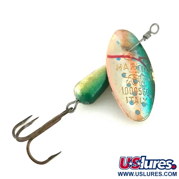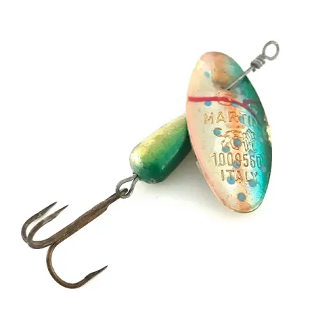 Präglingen på det silverpläterade skeden bekräftar att denna Panther Martin 6, produktkod 8536, har sitt ursprung i Italien, med den distinkta lejonlogotypen och patentnummer 1009560. Med en vikt på 3/16 oz (6 g) och ett mått på 2 1/4" (5,5 cm), uppvisar detta exemplar den klassiska droppformade kroppen med en gradient från grönt till guld. Den unikt designade skeden, som går direkt genom trådskaftet istället för att använda en bygel, visar en Blue/Silver-finish med tydliga blå prickar och en blågrön kant. Denna direkt-på-skaftet-montering är ett kännetecken för märkets ingenjörskonst, avsedd för en kroppsnära rotation. Bevarad i ett skick betygsatt till 5/5, förblir hårdvaran intakt mit en mörktonad original-trekrok. De italiensktillverkade versionerna av dessa spinnare är högt värderade av samlare för sin exakta prägling och specifika färgövergångar.