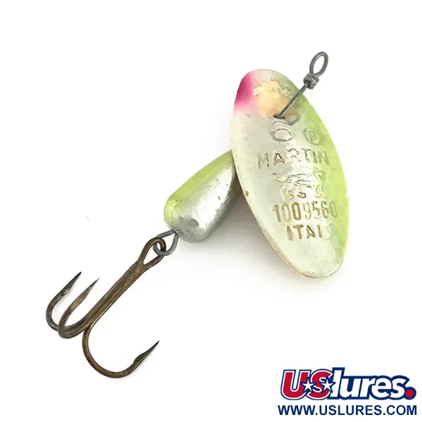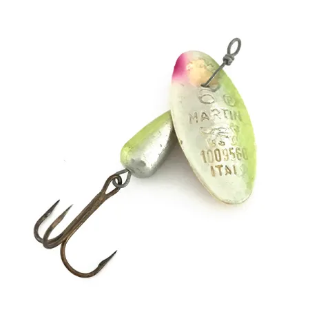 I silverbladets metall finns märkningen 'ITALY' tydligt stämplad, vilket vittnar om det europeiska hantverket hos denna vintage Panther Martin 6. Med en vikt på 6 g (3/16 oz) och en längd på 5,5 cm (2 1/4") har denna spinnare ett specifikt färgmönster som kombinerar en silverbas med en chartreuse-ton och en tydlig rosa accent i spetsen. Den droppformade kroppen, utformad för optimal viktfördelning vid kast, har en matchande finish i chartreuse och silver. En anmärkningsvärd teknisk egenskap hos denna modell, identifierad med produktkod 8537, är att skeden är monterad direkt på axeln i stället för på en bygel, vilket ger en fixerad rotationsaxel runt den centrala tråden. Hårdvaran inkluderar en trekrok med mörk finish monterad på stommen. Detta exemplar är i 5/5-skick, med originalfärg och skarpa stämplar kvar, inklusive numret 1009560 på skedbladet.