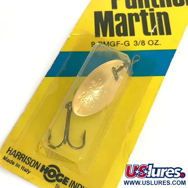 En glänsande guldpläterad sked utgör hjärtat i denna vintage-spinnare, designad för att reflektera ljus vid varje rotation. Med en vikt på 10,6 g (3/8 oz) är detta exemplar en tyngre variant i serien, vilket ger extra djup och kastlängd. Betet, som bär produktkoden 9 PMGF-G, har den karaktäristiska in-line-skeden monterad direkt på axeln, ett kännetecken för märkets tidiga design. Denna modell tillverkades i Italien för Harrison-Hoge Industries i Smithtown, N.Y., vilket markerar en specifik era av europeisk tillverkning och amerikansk distribution. Artikeln är oanvänd i sin originalförpackning i gult och blått, som har bevarat guldfinishen och den vassa trekroken i nyskick. Den kompakta droppformade kroppen är balanserad för stabil gång vid invevning i olika strömförhållanden.