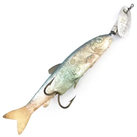 Denna italiensktillverkade spinnare, stämplad med registreringsnummer 103346 på sin silversked, uppvisar den klassiska ingenjörskonst som Panther Martin är känd för. Den realistiska beteskroppen mäter 14 cm (5 1/2") och har ett detaljerat fjällmönster med en mjuk blågrön toning längs ryggen. Med en vikt på 21 g (3/4 oz) inkluderar konstruktionen en viktad kulformad distans placerad mellan den karakteristiska axelmonterade skeden och den fiskformade kroppen. Under buken sitter en robust dubbelkrok, designad för säkra krokningar vid både spinnfiske och trolling. Detta exemplar, med produktkod 5013, är i ett välbevarat 4/5-skick och visar tydliga detaljer vid ögon och gälar samt det inpräglade 'MARTIN'-märket i metallen. Stjärten och fenorna har med tiden fått en lätt gyllene nyans som kontrasterar vackert mot den silvriga mittsektionen.
