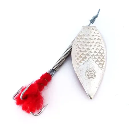 Denna italienska spinnare väger 3 g (3/32 oz) och är byggd kring ett karaktäristiskt system med bladet monterat direkt på axeln. Modellen Francese Tirlindada con Lana har en total längd på 5,5 cm (2 1/4") och har ett silverfärgat blad med ett texturerat fjällmönster och rödspetsad ände. En spiralfjäder utgör kroppen och leder ner till en trekrok som är omsorgsfullt lindad med röd ull. Den autentiska runda Panther Martin-stämpeln är synlig på silverbladet och markerar dess italienska hantverk. Detta exemplar med produktkod 10351 är oanvänt, vilket bevarar färgkombinationen Silver / Röd och integriteten hos den ullklädda kroken.