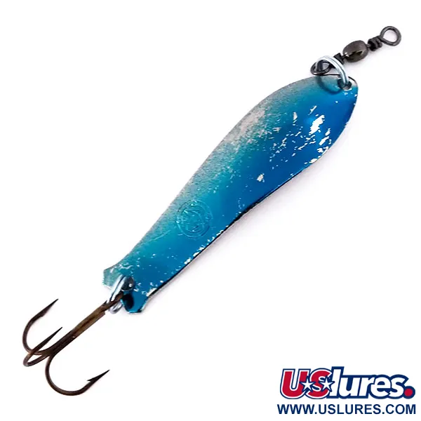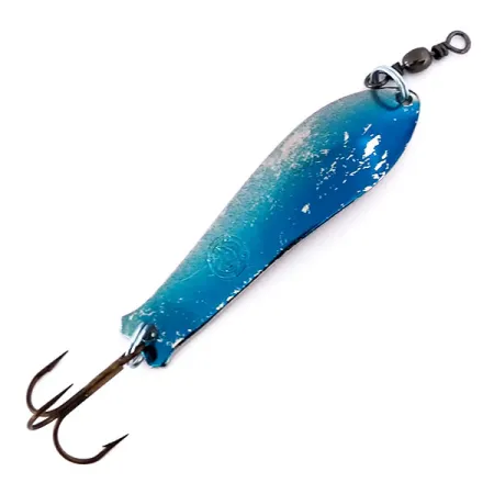 Nickel- och blå ytbehandlingar definierar estetiken hos denna Panther Martin Lampo Pesante da Lancio, identifierad med produktkod 10273. Med en längd på 6 cm (2 1/4") och en vikt på 11 g (2/5 oz) är betet ett gediget val för att nå djupare ståndplatser. Den texturerade blå finishen på utsidan har applicerats över en nickelbas, som lyser igenom i ett unikt, väderbitet mönster. Graderad till 4/5 i skick, visar exemplaret lätta hanteringsmärken men bibehåller sin strukturella integritet. På baksidan ger den polerade nickelytan en ljus reflekterande kontrast. Italienskt hantverk är tydligt i valet av hårdvara, som inkluderar en trekrok och ett förinstallerat lekande fäst med fjäderringar. Designad speciellt för kastfiske, tillåter kroppens tunga profil en stabil flykt och kontrollerat djup under invevningen.