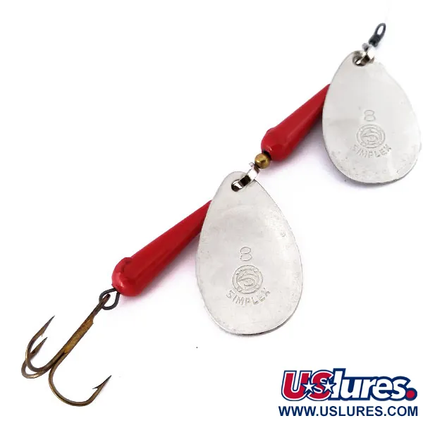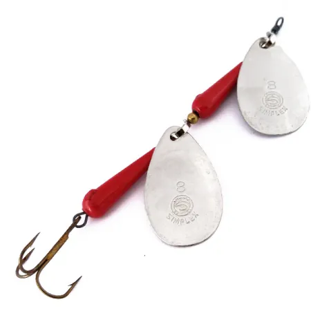 Präglingen på de förnicklade skedarna avslöjar den klassiska "SIMPLEX"-logotypen och siffran "8", vilket markerar denna italiensk-tillverkade Panther Martin Simplex Tandem, artikelnummer 10546, som en seriös vintage-modell. Med en vikt på 14g (1/2oz) och en längd på hela 10cm (4"), har denna tandemspinnare två separata skedar monterade på en enda trådaxel. Mellan dessa skedar och den avslutande trekroken sitter koniska, livfullt röda kroppar separerade av små mässingspärlor som fungerar som distanser. Till skillnad från en vanlig spinnare med en sked, multiplicerar denna konfiguration de visuella reflektionerna från förnicklingen i vattnet. Detta specifika exemplar är oanvänt och visar det orörda skicket på dess ursprungliga fabriksfinish från axeln ner till kroken. Metallkomponenterna är fortsatt blanka, vilket framhäver hantverket bakom dessa italienska exportvaror från mitten av århundradet. Varje sked roterar direkt runt axeln, en signatur för designen som undviker användning av en separat bygel. Den vassa trekroken är säkert fäst baktill, lämpad för kast i stark ström eller djupare höljor.