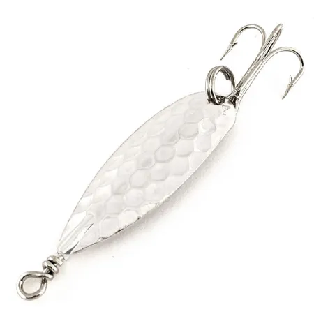Hamrade nickelytor ger en distinkt visuell profil, och denna Panther Martin Svizzero Martellato har en vackert texturerad yta som karaktäriserar modellen. Med en vikt på 3,3 g (1/8 oz) är spinnaren balanserad för lätt spinnfiske där ett subtilt blänk föredras. Produktkod 12257 identifierar detta italiensktillverkade exemplar, som mäter exakt 4 cm (1 1/2"). Den presenteras i oanvänt skick och metallytorna behåller sin ursprungliga fabriksglans utan tecken på ålder eller slitage. En robust trådaxel löper genom mitten och slutar i en tvinnad ögla, medan bakre delen har en fjäderring för montering av trekroken. Svizzero Martellato-designen förblir en stapelvara för sportfiskare som jagar öring eller abborre, tack vare den solida konstruktionen och de traditionella materialen som varumärket är känt för.