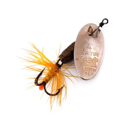 Stämplad med "ITALY" och patentnummer 331544 på skeden, visar denna vintage-spinnare upp den högkvalitativa tillverkningen från sin tid. Denna Panther Martin Zavorra con Mosca 4, produktkod 10554, har den signaturkonstruktion där skeden är monterad direkt på axeln, vilket gör att den roterar runt utan bygel (clevis). Detta exemplar är i färgen Guld, vilket syns i de rika, djupa tonerna på den viktade droppformade kroppen. Trekroken är noggrant klädd med orange-ginger hackelfjädrar och avslutad med en tydlig röd ullmarkering, vilket identifierar den som en fjädrad typ. Betet mäter 4 cm (1 1/2") och väger 3 g (3/32 oz), och är ett klassiskt exempel på en spinnare för lätt öringfiske. Metallskeden har en ren finish och det totala skicket på detta exemplar bedöms till 5/5. Äkta italiensktillverkade Panther Martins som denna är högt värderade av samlare som uppskattar den exakta stämplingen och balanserade viktningen som finns i dessa tidiga europeiska exportvaror.
