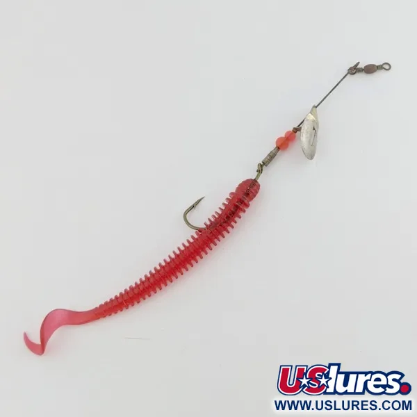 Nickelpläteringen på bladet på denna 6 g (3/16 oz) spinnarrigg ger ett subtilt blänk mot den livliga röda jiggen i mjukplast. Med en total längd på 10 cm har Pflueger June Bug №4 den karakteristiska offset-armen, utformad för att bladet ska kunna rotera fritt från huvudaxeln. Två röda pärlor på tråden ger en färgklick och hjälper till att balansera riggen. Riggen är utrustad med en enkelkrok agnad med en räfflad curly-tail-jigg som ger en betydande profil under vattnet. Med ett skickbetyg på 4/5 har metalltråden och komponenterna bibehållit sin styrka över tid. Denna specifika produkt, kod 24501, representerar ett klassiskt sätt att kombinera ett metallbete med en mjuk trailer.