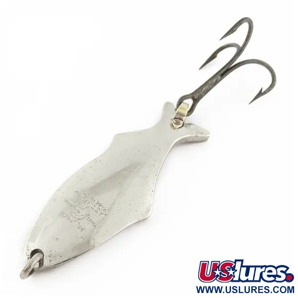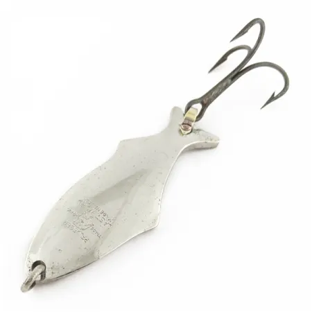 En robust förnickling täcker den 7 cm (2 3/4") långa kroppen på detta klassiska skeddrag för spinnfiske. Denna Pflueger Last Word, identifierad med produktkod 24224, väger exakt 14 g (1/2 oz). Den stansade texten på den konkava sidan är tydlig och visar dess ursprung med "Made in USA" tillsammans med modellnamnet. Komponenterna inkluderar en rejäl trekrok monterad med en kraftig fjäderring i stjärten, samt en ögla för lininfästning i nosen. I ett skick på 4 av 5 är metallytorna rena och den övergripande konstruktionen förblir solid. Kroppen har en subtil fiskformad siluett med en tydlig breddning nära mitten och en avsmalnande bakkant.