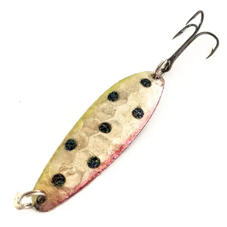 Den hamrade bikakestrukturen skapar komplexa reflektioner på den försilvrade ytan av detta skeddrag från Pirate Lures, ett högkvalitativt bete tillverkat i USA. Med en längd på 6,5 cm (2 1/2") och en vikt på 12 g (2/5 oz) är Pirate Joe's Silver Plated perfekt balanserad för ett mångsidigt fiske. Finishen har en ljus gröngul ton längs ryggen och en rosa-röd nyans på buken, prydd med sju glittrande svarta prickar som skapar tydliga huggpunkter mot silverbasen. Baksidan framhäver den blanka försilvringen och djupet i det präglade fjällmönstret. Utrustad med original fjäderringar och en vass trekrok, är detta exemplar (artikelnummer 12483) i 5/5 skick. Silverfinishen har kvar sin lyster och visar det hantverk som kännetecknar vintage Pirate Lures, designade för både spinnfiske och trolling.