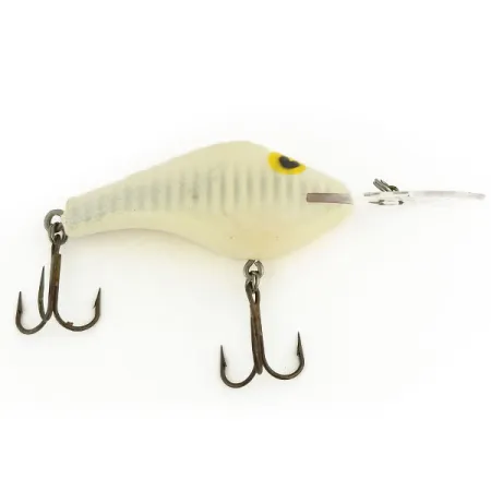 Handsnidad i förstklassigt cederträ visar detta exemplar det klassiska hantverk som är synonymt med det Kalifornien-baserade märket Poe's. Kroppen har ett mönster i vitt och grått, kännetecknat av subtila vertikala grå ränder över en krämvit bas, accentuerat av distinkta gula ögon med en svart pupill i "pac-man"-stil. Med en tyngd på 21 g (3/4 oz) och en längd på 8 cm (3 1/4") är denna Poe's Super Cedar (produktkod 9721) en rejäl wobbler byggd för djupet. En stor, klar dyksked i plast är säkert integrerad i nosen, stämplad med tillverkarens namn och utrustad med en robust linhögla. Hårdvaran inkluderar två trekrokar fästa via starka fjäderringar, där alla metallkomponenter har ett rent utseende. Skicket på betet bedöms till 4/5, med endast lätta hanteringsmärken medan integriteten i den ursprungliga cederkonstruktionen bevarats. Dessa beten är tillverkade i USA och var populära bland sportfiskare för den specifika flytkraft och naturliga resonans som bara trä kan ge.