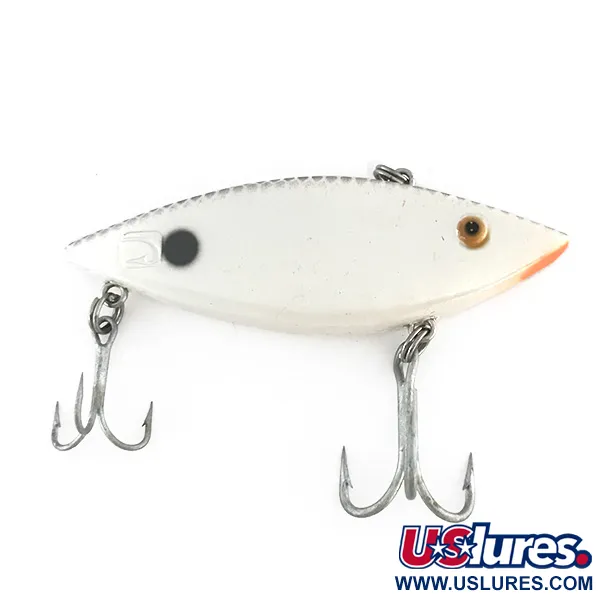 Pärlemorfinish på en kropp på 14 g (1/2 oz) ger hög synlighet vid olika vattenförhållanden, ett utmärkande drag för detta klassiska amerikansktillverkade bete. Denna Producers-modell, listad under kod 8419, mäter 7,5 cm (3") och är i oanvänt skick, betygsatt 5/5. Den sjunkande designen möjliggör fiske på varierande djup, vilket tillåter målinriktat fiske efter arter som gös, öring och gädda genom antingen spinnfiske eller trolling. Visuellt har betet en ren vit kropp med en touch av orange vid nosen och en svart prick med hög kontrast nära stjärten. Ett guldfärgat öga sitter långt fram på den lipless-profilen, som är utrustad med två robusta trekrokar. Detta exemplar är ett välbevarat exempel på funktionellt amerikanskt hantverk från mitten av 1900-talet.