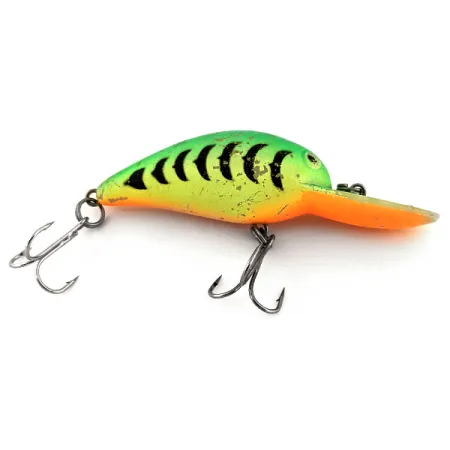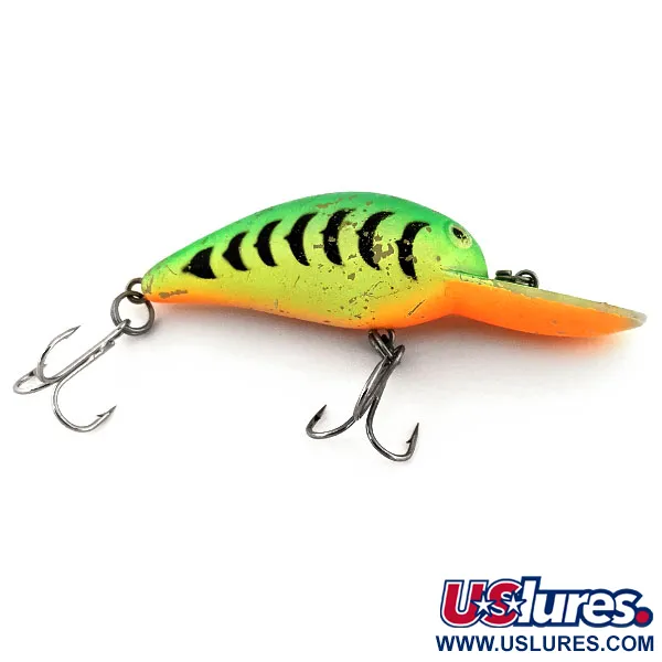 Detta klassiska amerikansktillverkade bete i det livfulla färgmönstret Fire Tiger är konstruerat för både spinnfiske och trolling. Med en vikt på 1/3 oz (10 g) och en längd på 2 1/4" (5,5 cm) riktar sig Producers B52 UV mot gös och gädda på ett djup mellan 1,8–2,4 m (6–8 fot). Denna flytande modell med rasselkammare har produktkod 13175 och utmärker sig med sina UV-reaktiva egenskaper. Vid exponering för ultraviolett ljus lyser finishen starkt, en funktion framtagen för att öka synligheten i djupt eller grumligt vatten. Betet är utrustat med två vassa trekrokar och kroppen har ett lätt, genuint slitage som motsvarar skicket 4/5. Den starkt orangea strupen och skeden ger en skarp kontrast mot den grönsvarta ryggen.