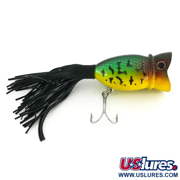 Detta USA-tillverkade ytbete mäter 3,8 cm (1 1/2") i längd och har ett djärvt Fire Tiger-färgschema som övergår från mörkt olivgrönt på ryggen till en lysande chartreuse-gul buk. Svarta vertikala ränder bryter av sidoprofilen, medan den djupröda konkava munnen är utformad specifikt för ytfiske. Med en vikt på 7,1 g (1/4 oz) är Producers Popper (produktkod 8476) riggad med en silverfinish-trekrok på buken och ett tätt knippe av svarta gummifransar baktill. Detta exemplar från The Producers är i 5/5-skick, med en ren finish och vassa krokar. Man kan se det intrikata fjällmönstret tryckt över den gröna delen av kroppen, vilket ger en visuell textur typisk för märkets känsla för detaljer. Inre rasselkulor ger en ljudkomponent vid fiske efter gädda och abborre.