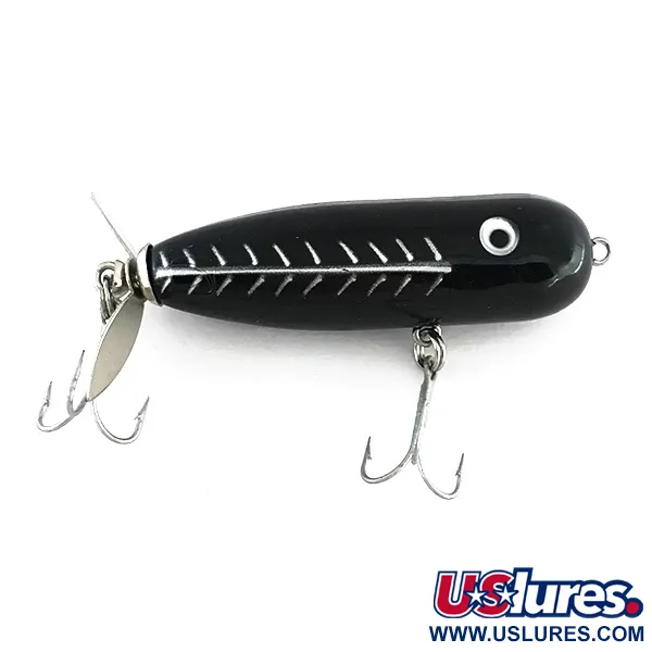 Utrustad med ett slående silverfärgat fiskbensmönster mot en djupsvart finish, erbjuder Producers Turbo en klassisk estetik för alla som älskar ytfiske. Med en vikt på 9 g (1/3 oz) och en kompakt längd på 6 cm (2 1/4") fungerar detta USA-tillverkade ytbete som ett flytande propbait för abborre och gädda. Betet har en enkel bakmonterad silverpropeller och en kulformad profil. På sidorna kontrasterar de silverfärgade markeringarna i bone-stil skarpt mot den glansiga svarta kroppen, kompletterat med stora vita ögon med svarta pupiller. På undersidan har betet två trekrokar fästa med robusta ringar. Detta specifika exemplar med produktkod 8076 har ett skickbetyg på 5/5, vilket återspeglar dess välvårdade tillstånd och de blanka metalldetaljerna.