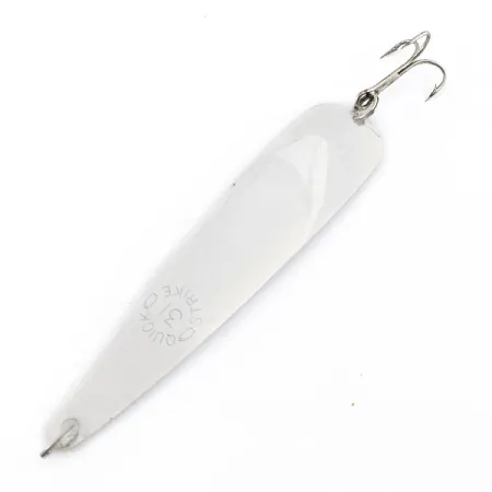 På den nedre halvan av bladet finns en tydlig stämpel med texten 'QUICK STRIKE 31' som identifierar detta klassiska amerikanska skeddrag. Med en längd på 9,5 cm (3 3/4") och en vikt på 4,5 g (3/16 oz) har betet en slank, avsmalnande kropp i högpolerat silver. Detta exemplar är i utmärkt skick, med en blank, reflekterande yta och intakta komponenter, vilket motiverar ett skickbetyg på 5/5. En enkel trekrok sitter monterad med en fjäderring i den bredare basen, medan den smala främre delen har ett distinkt hål för lininfästning. Katalogiserad under produktkod 22320, märks detta sällsynta föremåls unika karaktär i dess enkla men effektiva metallkonstruktion avsedd för både spinnfiske och trolling.