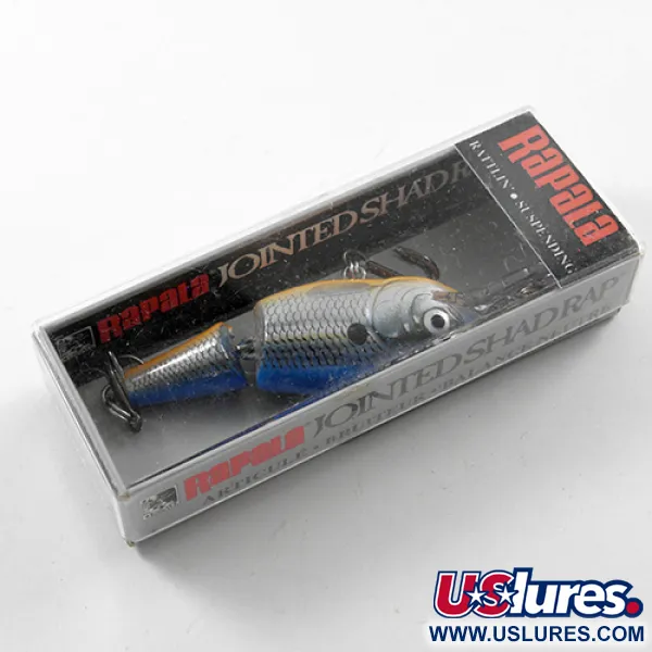 Tillverkad på Irland, detta exemplar har ett mönster i ljusblått över silverskal, komplett med en mörk sidofläck och orange buk. Denna Rapala Jointed Shad Rap Rattlin 40, med produktkod 1832, är ett svävande (suspending) bete på 5 g (3/16 oz) som mäter exakt 4 cm (1 1/2"). Det är i oanvänt skick och förvaras i sin originalförpackning som anger ett simdjup på 1,2 - 1,8 m (4'-6'). Den tvådelade kroppen är konstruerad för en specifik simrörelse vid jämn invevning, medan den inre rasselkammaren ger ett akustiskt element till presentationen. Som en suspending-modell gör konstruktionen att den håller djupet vid vevstopp, vilket gör den till ett tekniskt val för fiske i mellanvattnet.