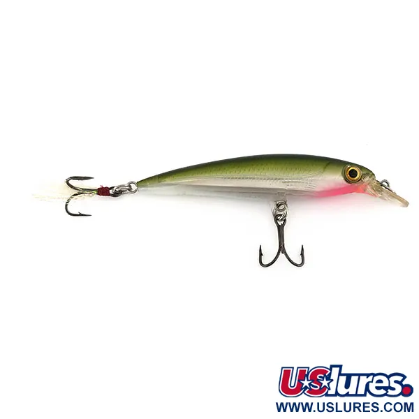 Olivgröna gradienter definierar den övre profilen på detta Estlandstillverkade exemplar på 1/4oz (7g), ett framstående exempel ur X-RAP-serien. Kroppen är 3 1/4" (8cm) lång och har texturerade silversidor som möter ett mjukt rosa-rött strupparti nära huvudet. Denna modell, listad under produktkod 9633, har en klar sked avsedd för djup mellan 0,6 - 1,2 m (2-4 ft). En märkbar detalj är SureSet-kroken bak, som är prydd med vita fjädrar och reflekterande tinsel för att ge en tydlig huggpunkt. Betet har betyget 5/5 och uppvisar ett felfritt yttre med intakta holografiska 3D-ögon och inget synligt slitage på krokar eller fjäderringar. Inuti finns en långkastningsmekanism och holografisk folie för djupverkande reflexer.