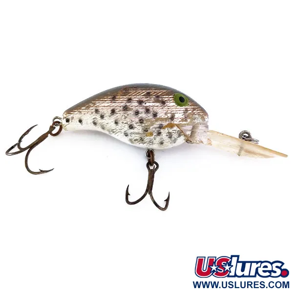 Ett distinkt mönster av regnbågsöring definierar estetiken hos denna wobbler, med en mörkt olivgrön rygg och silverfärgade sidor med svarta prickar. Med en vikt på 10,5 g (3/8 oz) och en längd på 5 cm (2") är detta exemplar utrustat med en djupgående transparent sked avsedd att nå djup på 2,4 - 3,0 m (8-10 ft). Den överdimensionerade skeden är signum för Deep Wee R-serien, designad för effektivt spinnfiske och trolling i djupt vatten. Intensivt gröna ögon sticker ut mot det mörkare huvudet, medan kroppen har en fin fjällstruktur gjuten i ytan. Skicket är 4/5, med lätta ytmärken och viss mörk missfärgning på originaltreöringarna från tidigare användning. Stämplad med produktkod 10655, betet behåller sina originalfjäderringar och komponenter.