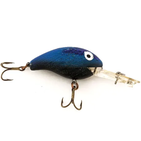 Med en längd på 5 cm (2") har kroppen på Rebel Deep Wee R en fin korsmönstrad fjällstruktur som övergår från en djupblå ovansida till en mörk, skuggad buk. De överdimensionerade vita ögonen med centrerade svarta pupiller sticker ut mot den blå finishen och ger huvudet en klassisk, alert profil. En stor, klar haksked är stämplad med Rebel-logotypen och gör att betet kan nå djup på 2,4–3,0 m (8–10 fot) vid kastfiske eller trolling. Detta flytande bete på 10,5 g (3/8 oz), identifierat med produktkod 11210, håller en respektabel 4/5-kondition och visar endast lätt ytslitage på den ursprungliga metallhårdvaran. Originalkrokarna (trekkrokar) är intakta och robusta.