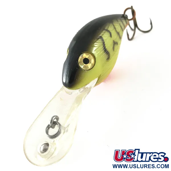 Vertikala mörka ränder över en gulgrön kropp definierar Perch-finishen hos denna djupgående specialist. Med en vikt på 10,5 g (3/8 oz) och en längd på 5 cm (2"), bär detta exemplar produktkod 6706 och är i 5/5 skick. Den överdimensionerade genomskinliga skeden är konstruerad för att nå djup på 2,4 till 3,0 m (8 till 10 fot), vilket möjliggör effektiv täckning av djupa strukturer. En distinkt orange buk ger en visuell hög kontrast, medan linfästet är monterat direkt på skeden för stabilitet under invevning. Detta USA-tillverkade bete har gjutna ögon och vassa trekrokar, vilket speglar den klassiska konstruktionen i Deep Wee R-serien.