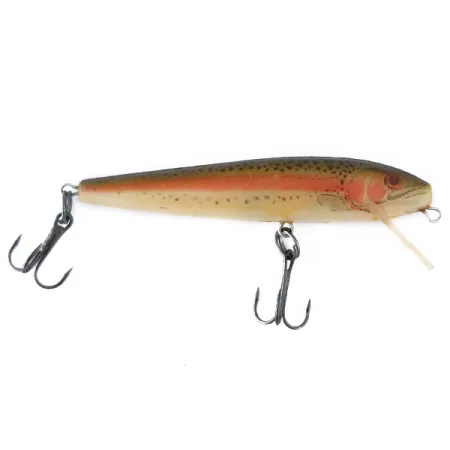 Denna USA-tillverkade minnow väger 1/8oz (4g) och uppvisar det detaljerade hantverk som Rebel blev kända för under sina tidiga år. Betet, med produktkod 11085, har ett realistiskt Rainbow Trout-mönster på en Ghost-bas, vilket ger en subtil genomskinlighet. Kroppen i plast mäter 2 3/4" (7cm) och är utrustad med två vassa trekrokar som sitter säkert med robusta fjäderringar. Den integrerade klara hakskeden är utformad för att nå djup mellan 0,9-1,8m (3-6ft), vilket gör den till ett mångsidigt val för både spinnfiske och trolling. Detta exemplar är i 5/5-skick och visar på välbevarad hårdvara och fin prickighet längs sidorna. Sportfiskare har vanligtvis framgång med detta flytande bete genom en jämn invevning eller en klassisk stop-and-go-teknik.