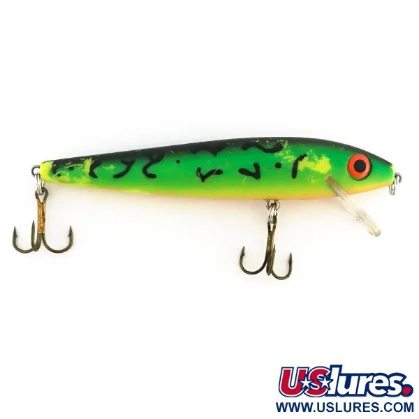 Denna Rebel Floater är 9 cm (3 1/2 tum) lång och har en plastkropp i det livfulla mönstret Green Tiger med mörk rygg och en högvisuell gul buk. Små svarta våglinjer ger den karakteristiska texturen längs sidorna, kompletterat med klassiska röda ögon som sticker ut mot det neongröna huvudpartiet. En klar haksked sätter simdjupet till mellan 1,2 och 1,8 m (4-6 fot), vilket gör den till ett pålitligt val för kastfiske på grunt vatten eller lätt trolling. Detta bete på 7 g (1/4 oz), med produktkod 8528, är i mycket gott skick (betyg 4/5) och har kvar sin originalmontering och lackering i fint skick. Tekniker som rak hemtagning eller rytmisk stop-and-go utnyttjar flytkraften i denna USA-tillverkade konstruktion till fullo.