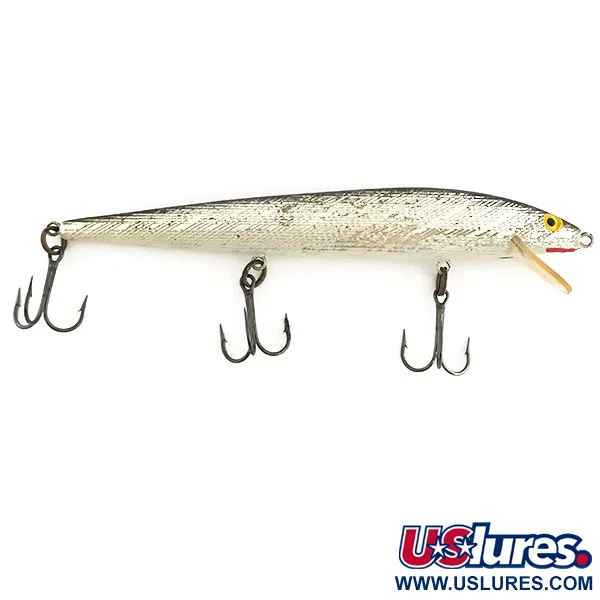 Silverfärgad fjällstruktur längs sidorna definierar denna klassiska Rebel Floater F14, ett givet val för den som jagar större rovfiskar. Med en längd på 14 cm (5 1/2") och en vikt på 14 g (1/2 oz) har denna USA-tillverkade wobbler i plast en tydlig svart rygg som kontrasterar kraftigt mot de metalliska sidorna. Huvudet är detaljerat med klargula ögon och ett litet rött färgdrag vid strupen, precis bakom den genomskinliga hakskeden. Den är designad för både spinnfiske och trolling och når djup mellan 1,2 och 2,1 m (4–7 ft) vid jämn invevning eller stop-and-go. Detta exemplar, med produktkod 9199, är i 4/5-skick och visar ärliga tecken på ålder som framhäver dess vintagekaraktär samtidigt som den är ett gediget tillskott till samlingen. Bestyckningen består av tre vassa trekrokar, och den folieliknande finishen fortsätter att reflektera ljuset effektivt över den strukturerade kroppen.