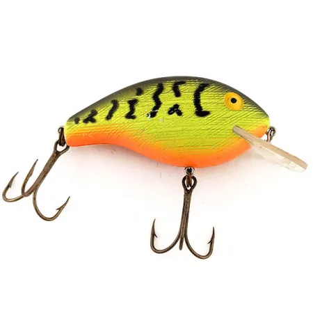 Fire Tiger-mönstret med dess högkontrastövergångar i neongult och orange gör denna 6,5 cm (2 1/2") wobbler till ett utmärkande val för synlighet. Rebel Mini R, som identifieras med produktkod 12868, har en texturerad kroppsyta som fångar ljuset under den mörka olivfärgade ryggen och de karakteristiska svarta vertikala ränderna. En klar, fyrkantig sked är stämplad med den klassiska Rebel-logotypen, designad för att nå djup mellan 0,4 m (1,3 ft) och 1,2 m (3,9 ft). Med en vikt på 17 g (3/5 oz) är detta exemplar ett samlarobjekt i 5/5-skick, som behåller sin livfulla fabriksfinish och originalkrokar. Oavsett om den används för spinnfiske eller trolling, beter sig betet som en suspender i vattenpelaren. Buken övergår i en djupt orange ton nära halsen, medan de gula ögonen med svarta pupiller ger en tydlig huggpunkt. Båda trekrokarna är i utmärkt skick och visar inga tecken på användning eller slitage på spetsarna.