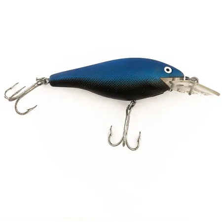 En djup, mattblå finish täcker den övre delen av detta betes texturerade kropp och övergår i en helsvart buk. Listad under produktkod 11576, mäter denna Rebel Shallow Fastrac 7 cm (2 3/4") och väger 9 g (1/3 oz). Det är en flytande modell idealisk för spinnfiske eller trolling, särskilt när du vill fiska på djup mellan 0,6 och 1,8 m (2 - 6 ft). Den klara, rundade dykskeden sitter stadigt och exemplaret visar mycket lite slitage med ett toppskick på 5/5. Noterbara detaljer inkluderar de klassiska vit-svarta målade ögonen och det finmaskiga fjällmönstret gjutet i plasten, karaktäristiskt för dessa USA-tillverkade Rebel-beten. Originaltrekorna är vassa och fästa med säkra fjäderringar. Denna specifika blå-svarta färgkombination valdes ofta för sin tydliga siluett mot ytan vid svaga ljusförhållanden eller i något grumligt vatten.