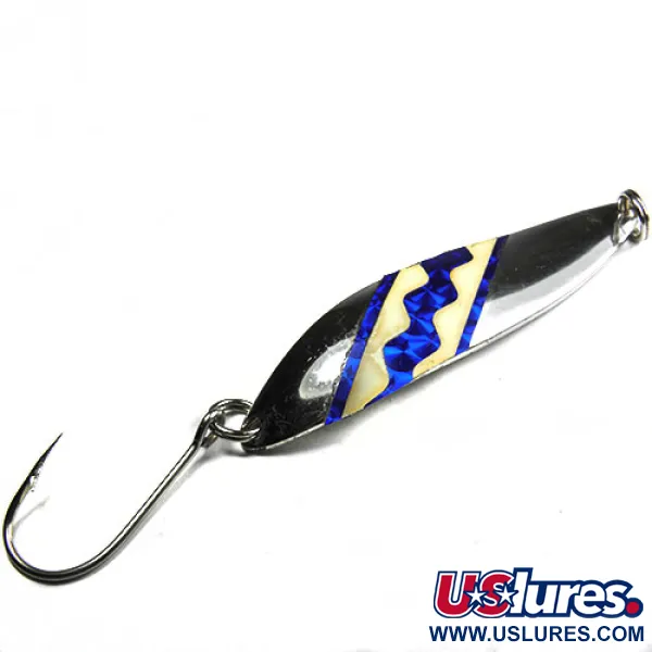 Tydligt präglat på den polerade baksidan av nickel bekräftar varumärket "RED EYE LURES" härkomsten för detta amerikansktillverkade skeddrag. Med en vikt på 1/2 oz (14 g) och en längd på 3 tum (7,5 cm) har metallkroppen en blå och krämvit zigzag-dekor med hög synlighet som ger en skarp kontrast mot den reflekterande nickelfinishen. Detta specifika exemplar, identifierat med produktkod 0287, är utrustat med en kraftig enkelkrok monterad med en robust fjäderring, vilket gör det till ett pålitligt val för kastfiske vid strukturer eller trolling på djupt vatten. Eppingers tillverkningskvalitet är tydlig i metallens tjocklek, vilket ger en betydande tyngd för dess storlek. Skicket på detta bete är en solid 4/5, med mycket välbevarade ytor och intakta dekaler.