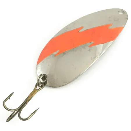 Förnickling ger en klassisk högblank bas för detta skeddrag på 10,5 g (3/8 oz), som har ett distinkt blixtmönster i fluorescerande orange på sin konvexa sida. Red Eye-skeden (artikelkod 6626) mäter 6 cm (2 1/4") och uppvisar precisionen i amerikansk tillverkning, med varumärket Red Eye Lures tydligt stämplat på den konkava insidan. Detta specifika trolling-exemplar är i 5/5-skick och behåller en ljus, reflekterande finish och starkt pigment utan betydande slitage. Maskinvaran består av en robust trekrok säkrad med en kraftig fjäderring, designad för att tåla trycket vid djuptrolling. En rent borrad fästpunkt i nosen möjliggör direkt knut eller användning av beteslås, vilket bibehåller betets strömlinjeformade profil.