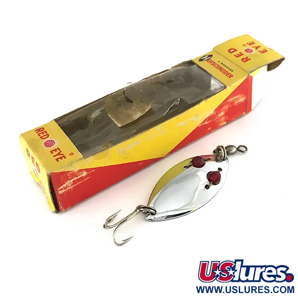 Två klarröda facetterade pärlor, modellens karaktäristiska "ögon", är säkert infattade i den polerade nickelkroppen på denna amerikanska klassiker. Denna skapelse från Hofschneider med produktkod 7583 väger 6,5 g (1/4 oz) och mäter 4,5 cm (1 3/4"). Draget är oanvänt i sin gul-röda originalask. Den högblanka nickelfinishen är utformad för maximal synlighet, vilket är särskilt effektivt vid långsam invevning efter gädda eller abborre i varmare vatten. Många års förvaring har lämnat vissa spår av hyllslitage på kartongen och plastförpackningen, men själva skeddraget har kvar sin ursprungliga fabriksglans. Det är utrustat med en vass trekrok och ett inbyggt lekande i nosen, en standardkonfiguration för denna typ av skeddrag för att minimera linvridning vid kast eller trolling. Stämplingen på metallkroppen identifierar tydligt dess ursprung från Hofschneider Corp. i Rochester, New York.