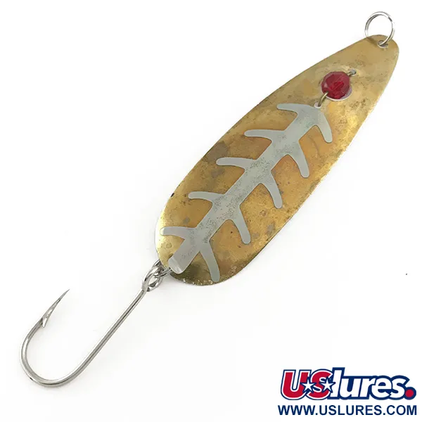 Guld- och vitfinish definierar det visuella uttrycket hos detta exemplar, katalogiserat under produktkod 6552. Eppinger, den anrika tillverkaren från USA, använde en 3 1/2" (9 cm) långsträckt kropp för denna specifika Red Eye Evil Eye-trollingmodell. Med en vikt på 1/3 oz (9 g) har skeddraget en dubbelsidig design där den guldpläterade framsidan är präglad med ett silverskelettmönster som slutar i en klar röd facetterad pärla. På baksidan övergår betet till en ren vit bas accentuerad av ett tryckt rött öga och ytterligare en röd juvelinsättning. Enkelkrok-konfigurationen tyder på ett fokus på att minska risken för bottennapp samtidigt som en solid krokning av större ädelfisk bibehålls. Skicket är graderat till 4/5, vilket innebär att hårdvara och finish är välbevarade och uppvisar den hållbarhet som är synonym med klassiska amerikanska metallbeten.