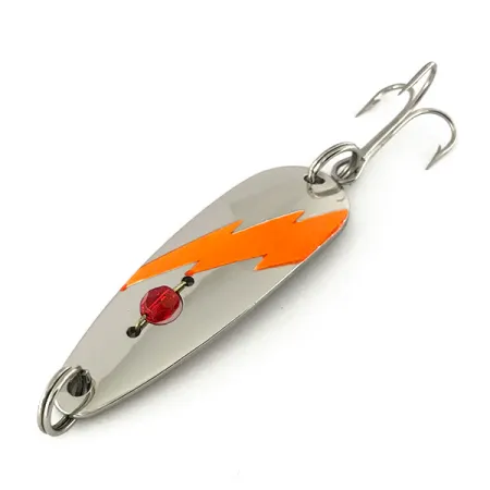 Förnicklingen skapar en bakgrund med hög lyster för den livfulla orangea blixt-dekalen på denna Red Eye Lures Evil Eye UV. Detta skeddrag med produktkod 7556 väger 1/2 oz (14 g) och har en längd på 2 1/4" (5,7 cm). Ett kännetecken för denna USA-tillverkade modell är den facetterade röda pärlan monterad i skeden nära fjäderringen för linan, som fångar ljuset annorlunda än den polerade metallen. Vid exponering för ultraviolett ljus reagerar den orangea fluorescerande blixten med ett starkt sken, vilket underlättar synligheten i djupare eller mörkare vatten. Draget är utrustat med en standard trekrok och fjäderringar. Just detta exemplar är i oanvänt skick och uppvisar originalfinish från fabriken utan några tecken på slitage.