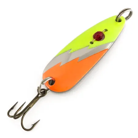 Med en vikt på 1/2 oz (14 g) är den trefärgade finishen på detta skeddrag uppdelad av ett karakteristiskt sicksackmönster. Denna Red Eye Lures Red Eye Evil Eye UV-modell, produktkod 7648, kombinerar en polerad nickelbas med levande segment i orange och chartreuse. En viktig egenskap hos detta USA-tillverkade skeddrag är den facetterade röda glaspärlan monterad genom den övre delen av kroppen, som fungerar som en tydlig huggpunkt. Under ultraviolett ljus lyser de fluorescerande färgsektionerna med hög intensitet, vilket avsevärt ökar synligheten vid fiske i djupt vatten eller under mulna dagar. Betet är 2 1/4" (5,7 cm) långt och är utrustat med originalkomponenter, inklusive kraftiga fjäderringar och en vass trekrok. Detta exemplar är oanvänt och i utmärkt skick.