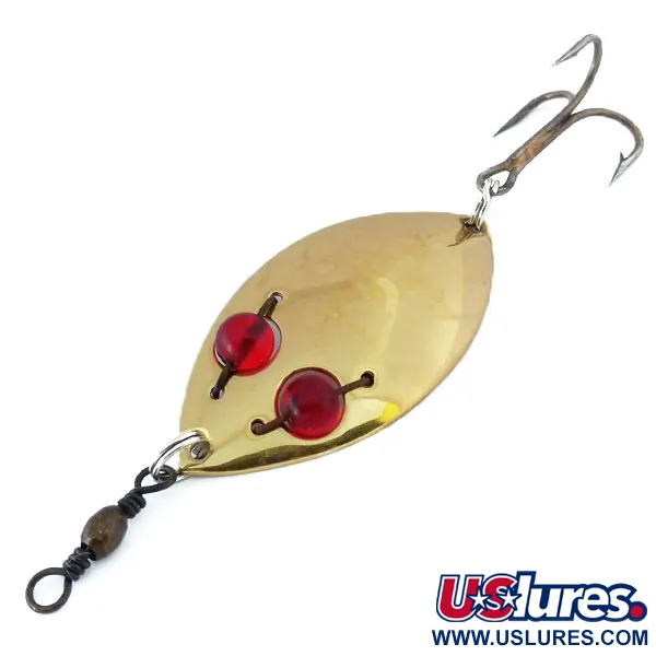 Med en glittrande klassisk guldfinish visar den pressade kroppen på detta skeddrag stolt upp sitt ursprung från Rochester, NY, och sitt ursprungliga patentnummer. Med en vikt på 1/2 oz (13 g) och ett mått på 2 1/4" (5,5 cm) är Hofschneider Red Eye junior ett måste för samlare som uppskattar amerikanskt hantverk från mitten av århundradet. Två framträdande röda glaspärlor är säkert fastsurrade i dragets framsida, utformade för att fånga och reflektera ljus under en jämn invevning. Detta specifika exemplar har produktkod 10929 och är i 5/5-skick, med en blank metallyta och välbevarade detaljer. Baksidan har stämpeln "RED EYE WIGGLER JR." tillsammans med Hofschneider Corp.-logotypen. En robust trekrok är fäst via en stadig fjäderring, parad med en lekare i fören för linhanteering. Detta skeddrag är optimerat för fiske efter gädda och abborre, särskilt när en långsammare presentation krävs i varma vattenförhållanden.