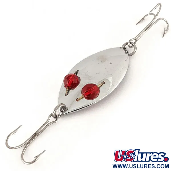 Stora, ljusreflekterande röda ögon definierar det visuella uttrycket hos detta förnicklade skeddrag med produktkod 12440. Med en vikt på 13 g (1/2 oz) och en längd på 5,5 cm (2 1/4") är Red Eye junior från Hofschneider Corp. en klassiker inom amerikansk vintage-utrustning. Kroppen, tillverkad i USA, är utformad för tekniker som gynnas av en långsam invevning, vilket låter gädda och abborre fokusera på metallens glitter under sommarhettan. Två vassa trekrokar är monterade i vardera änden av betet, vilket ger flera fästpunkter för nyfikna rovfiskar. Detta exemplar har skicket 5/5 och uppvisar en välbevarad polerad yta samt säker montering av de facetterade röda pärlorna. Tillverkarens stämpling på den konkava sidan är fortfarande tydlig och läsbar, vilket bekräftar dess ursprung som ett autentiskt stycke fiskehistoria från mitten av seklet.