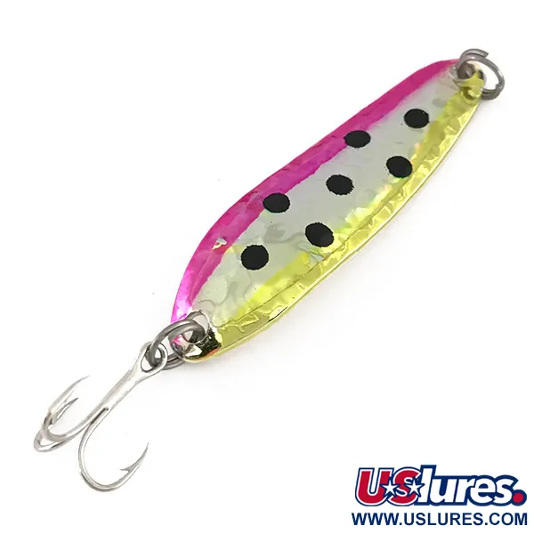 Detta skeddrag väger 9g (1/3oz) och har en klassisk hamrad finish designad för att sprida ljus i flera riktningar. Silver / Rainbow Trout-mönstret är särskilt väl utfört på detta exemplar, med en livlig rosa överkant och en gul underkant som flankerar ett silverfärgat center. Fem tydliga svarta prickar är placerade längs mittlinjen på den 5,5cm (2 1/4") långa kroppen för att efterlikna utseendet av en simmande öring. Om man vänder på draget syns varumärket Renegade stämplat direkt i den polerade silverfärgade baksidan tillsammans med dess ursprung USA. Identifierad med produktkod 7899, består hårdvaran av en vass trekrok säkrad med fjäderringar i båda ändar för en pålitlig koppling. Skicket är 5/5, då draget behåller sin ursprungliga fabriksglans på alla ytor. Denna modell är konstruerad för mångsidig användning vid både spinnfiske och trolling.