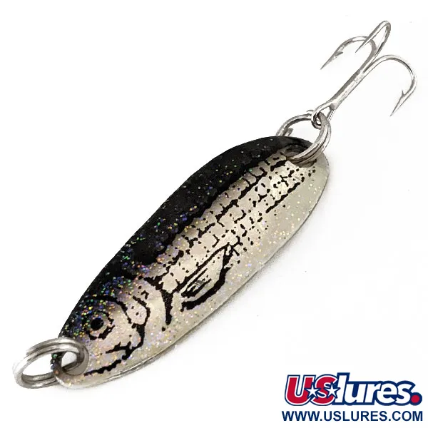 Renegade Crystalina Spoon - Honeycomb Series mäter 4 cm (1 1/2") i längd och har en karakteristisk Minnow-finish där en glittrig svart rygg möter en silverfärgad bas med tryckta detaljer av fiskhuvud och fjäll. Detta skeddrag på 7 g (1/4 oz) har produktkod 11188 och är utrustat med hållbara fjäderringar och en vass trekrok i stjärten. Baksidan av skeden är i polerat silver, vilket ger en ljus kontrast mot den mönstrade framsidan. Skicket på detta exemplar är 5/5, då både finish och komponenter är i nyskick.