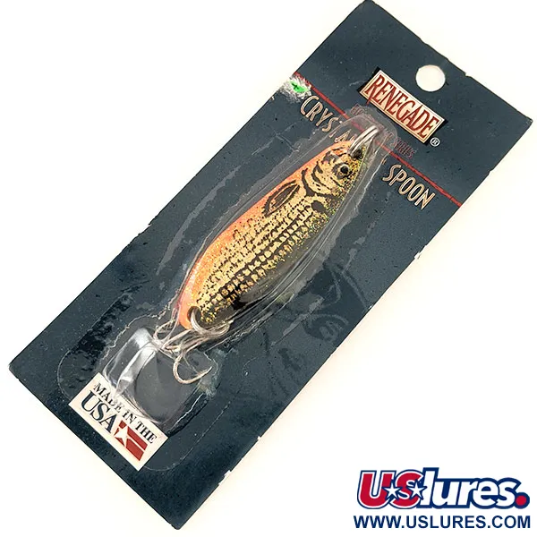 Med en mångsidig längd på 5,5 cm (2 1/4") har detta skeddrag i metall en distinkt bikakestruktur som är specifikt utformad för att manipulera ljusreflektion. Renegade Crystalina Spoon - Honeycomb Series väger 11 g (2/5 oz), bär produktkoden RCS114 GT och uppvisar en färgövergång från guld till orange med ett svart fjällmönster. Detta exemplar är oanvänt, fortfarande i sin originalförpackning från Renosky Lure, Inc. i Indiana, Pennsylvania. Det USA-tillverkade draget är utrustat med en högkvalitativ Eagle Claw-krok och har en mjuk, opalescent finish avsedd att efterlikna det realistiska utseendet hos betesfisk i olika vattenförhållanden.
