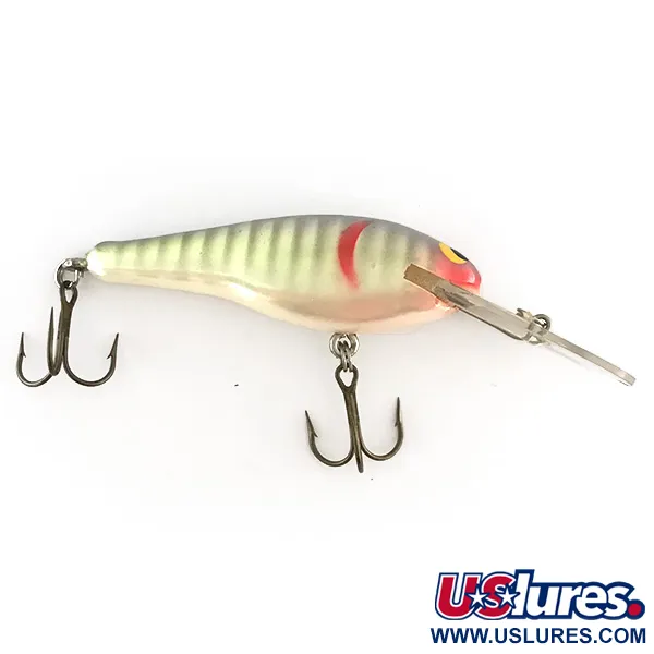 Kroppen på denna Renegade Little Diver är täljd i Jelutong-trä och har en pärlemorfinish med UV-reaktiva egenskaper. Med en vikt på 9 g (1/3 oz) och en längd på 7 cm (2 3/4") är detta kastbete byggt för fiske efter arter som färna och abborre på djup upp till 2 m (6,5 ft). Det visuella mönstret består av mörka vertikala ränder över pärlemorskimrande sidor, accentuerat av en tydlig röd gälmarkering bakom ett klassiskt gul-svart öga. Varje exemplar i 8475-serien har bearbetats för hand, vilket garanterar en hög finish på trästommen. Just detta bete är i 5/5 skick och har kvar sin ursprungliga glans och vassa, oklanderliga trekrokar. Den klara skeden är säkert integrerad i huvudet, placerad för att nå måldjupet samtidigt som den naturliga flytkraften från träet bibehålls.