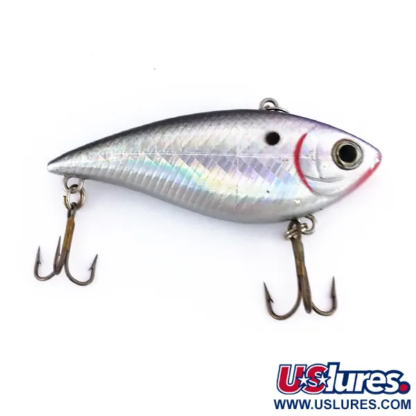 Rainbow Silver-finishen på denna lipless crankbait ger ett tydligt holografiskt skimmer som skiftar över spektrat beroende på ljusvinkeln. Med en vikt på 14g (1/2oz) är Renegade Pro Series (produktkod 9951) ett sjunkande bete konstruerat för både spinnfiske och trolling på varierande djup. Detta exemplar på 7cm (2 3/4") har ett texturerat fjällmönster längs sidorna och en framträdande rödkantad gälplatta som ger en subtil kontrast. Klassad som en ljudlig rattlin, är den interna konstruktionen utformad för att rikta sig mot arter som gös, gädda och abborre under olika vattenförhållanden. Hårdvaran inkluderar två bronserade trekrokar, och det totala skicket på detta USA-tillverkade bete är 5/5. Dess profil med platt huvud och toppmonterade linögla är karakteristisk för Pro Series-designen, avsedd att nå specifika delar av vattenpelaren under invevning.