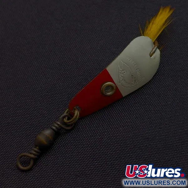 Detta skeddrag i metall är präglat med den distinkta Rex-fisklogotypen på den silverfärgade övre halvan och har ett klassiskt röd-vitt mönster. Med en vikt på 1/16 oz (1,7 g) och en längd på 111 1/4" (282,82 cm) är kroppen utrustad med en enkelkrok klädd i gula fjädrar. Fjädrarna är säkrade med en tät röd trådlindning, vilket ger en färgklick vid stjärten som kontrasterar mot huvudfinishen. En lekare är ansluten till den främre öglan för att hjälpa till att hantera linvridning under användning. Identifieringsmärken från Weezel är tydligt synliga på metallytan tillsammans med den präglade fiskgrafiken. Med minimala tecken på ålder i lacken håller detta exemplar skicket 4/5. Modell 24517 visar den enkla men effektiva hårdvara som är karaktäristisk för vintagebeten i olika material.