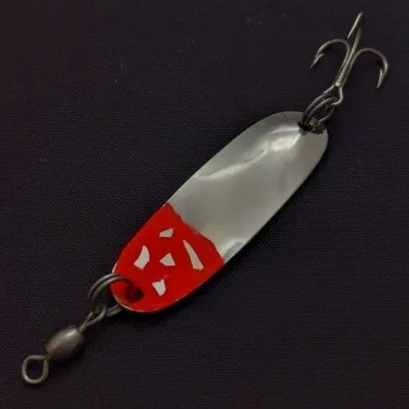 Detta skeddrag mäter 4,5 cm (1 3/4") och har en klassisk långsmal profil som lämpar sig för fiske efter öring eller abborrfiskar med lätt utrustning. Den pressade nickelpläteringen på den övre halvan ger ett stadigt blänk, vilket kontrasterar mot den nedre röda sektionen med vita detaljer. Med en vikt på 4 g (1/8 oz) är Roy Self #2 balanserad för kast i trånga fickor eller fiske längs vegetationsbälten. En subtilt konturerad yta på metallkroppen hjälper till att bryta ljusreflektioner, ett specifikt drag för Roy Self-design. Katalogiserad under produktkod 24587, är detta exemplar i 5/5-skick med en ren finish och tydliga färgövergångar. Ett förmonterat lekare i fören motverkar linvridning när draget vevas in genom vattenmassan.