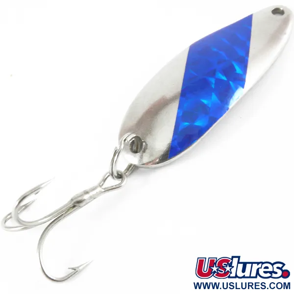 Blå holografisk prismatisk tejp delar den förnicklade kroppen på detta 2" (5 cm) skeddrag, vilket fångar ljuset med en distinkt geometri. Detta exemplar av Weaver Lure "Ruber Grabber", med produktkod 3729, är en klassisk amerikansk design från USA. Med en mångsidig vikt på 1/4 oz (7 g) har betet en stämplad baksida som tydligt visar modellnamnet i ett kraftfullt vintagetypsnitt. Nickelfinishen är ljus och högreflekterande, vilket ger den ett skickbetyg på 5/5 för dess utmärkta bevarande. En kraftig trekrok är säkrad med en robust fjäderring i stjärten, medan huvudet är förborrat för direkt knytning eller användning av beteslås. Den reflekterande blå insatsen är fackmannamässigt applicerad och visar inga tecken på att lossna från sitt ursprungliga fabriksutförande.