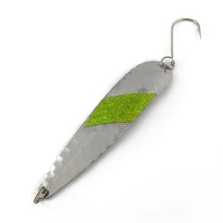 Med en vikt på 16 g (3/5 oz) har detta skeddrag en hamrad metallkropp med en mönstrad yta designad för att reflektera ljus genom ett bikakemönster. En snedställd, klar grön glitterrand i mitten av den silverfärgade finishen fungerar som en visuell huggpunkt. Betet mäter 11,5 cm (4 1/2") och är utrustat med en kraftig enkelkrok samt fjäderringar i både fram- och bakände. Denna Sammy PAC (07)-modell med produktkod 23629 är från 1986 och speglar tidens byggstil. Skicket uppvisar spår av en lång fiskehistoria, med ytslitage och oxidering som ger en genuin, välanvänd karaktär med bedömningen 1/5.
